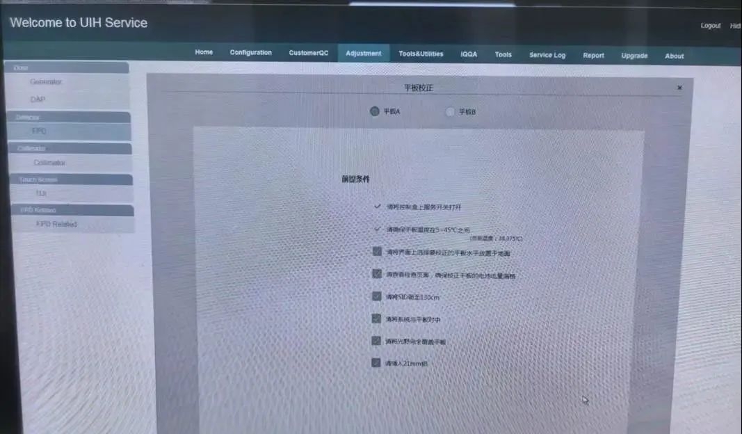 1. 打开软件服务界面,随后打开 adjustment-detector-FPD 界面,准备对两个无线平板进行依次校准,校准顺序为先 A 平板(床),再 B 平板(胸片架),两者均为无线平板,可直接拆卸。