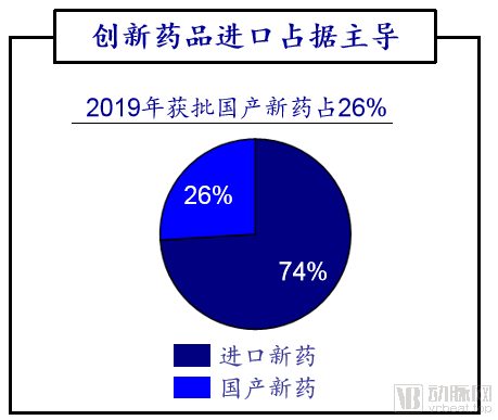 在创新药品方面,境外企业占据主导地位。2019年,NMPA共批准53个新药,其中进口新药共39个,国产新药仅14个,国产占比26.4%。