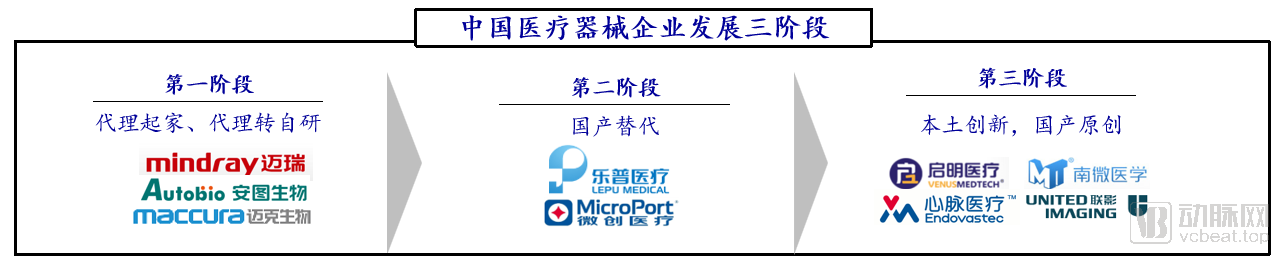 中国医疗器械企业发展至今,大概可分为三个阶段。第一阶段,以迈瑞医疗、安图生物、迈克生物等为代表的国产企业,从代理起家,由代理转为自主研发,研发的产品也逐渐从低端走向高端。