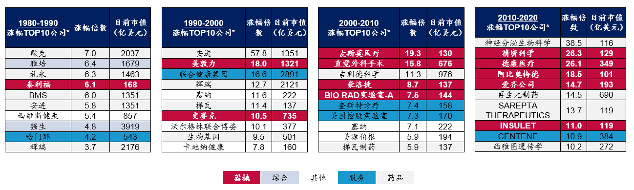 美股医药公司发展成熟度较A股高,美股医药股的发展趋势对A股有借鉴意义。美股从1980年至今,医药行业涨幅前十的公司中,器械公司越来越多。2010年医药涨幅前十公司中诞生了精密科学、德康医疗、阿比奥梅德、爱齐公司、INSULET等器械牛股。