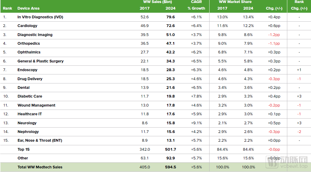 根据全球咨询公司Evaluate发布的报告《Evaluate MedTech, World Preview 2018,Outlook to 2024》,IVD、心血管、影像、骨科、眼科是全球市场规模最大的几个领域。