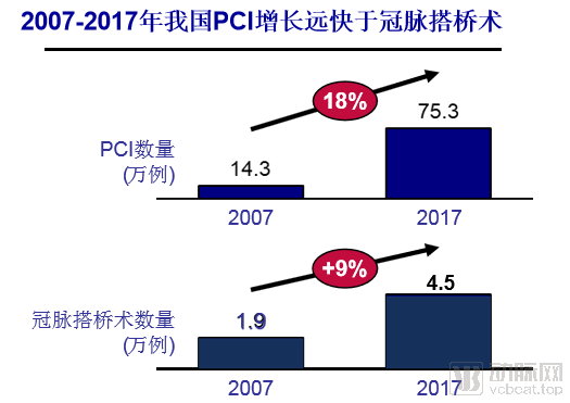 微创介入治疗发展迅速,2007年我国开展PCI共14.3万例,同期冠脉搭桥1.8-2万例,据中国心血管病报告,2017年全国开展PCI共75.3万例,据2017年中国心外科手术和体外循环数据白皮书,同期冠脉搭桥术4.5万例,PCI增速远快于冠脉搭桥术。微创介入手术量的迅速增长提高了相关医疗器械的市场渗透率,也培育了市场,为微创介入治疗市的场爆发奠定了基础。