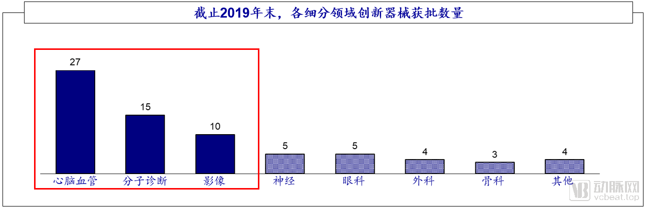 另一个维度,从创新活跃度来看,国内心脑血管、分子诊断、影像领域创新活跃。2014年国家创新医疗器械特别审查程序开启以来,截止2019年末,共批准73个创新器械,其中心脑血管器械27个,占比37%,分子诊断和影像分别为15、10个,占比21%、14%,其他领域有神经(7%)、眼科(7%)、外科(5%)、骨科(4%)等。