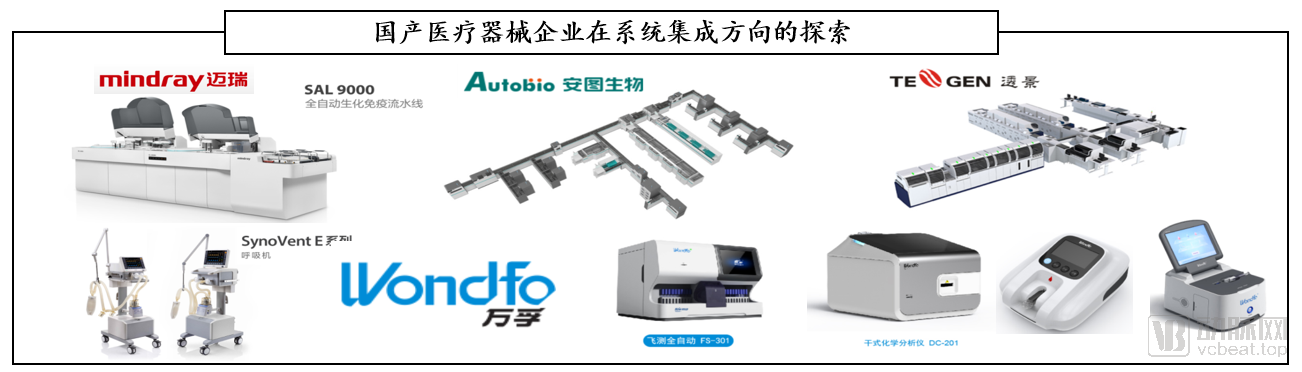 系统集成亦是创新的方向之一,国产医疗器械公司积极在此方向探索。例如,安图生物医学实验室全自动流水线 Autolas A-1 Series,迈瑞SAL 9000全自动生化免疫流水线,透景生命全自动高通量免疫检测系统,迈瑞重症监护室整体解决方案,万孚免疫荧光平台、电化学的血气、凝血、干涉生化等几款仪器组合的“一平米实验室”概念。
