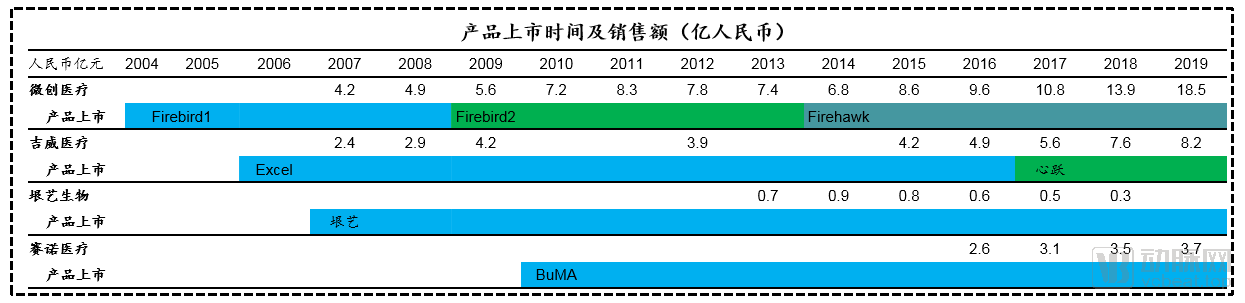 心脏支架领域,自2004年微创医疗发布第一代产品以来,其销售额迅速增长,到2019年达到18.5亿元人民币。吉威医疗、垠艺生物、赛诺医疗等企业也分别在2006、2007、2010年上市相关产品。随着市场的扩大,以上企业的销售额均不断上涨,为企业带来丰厚利润。