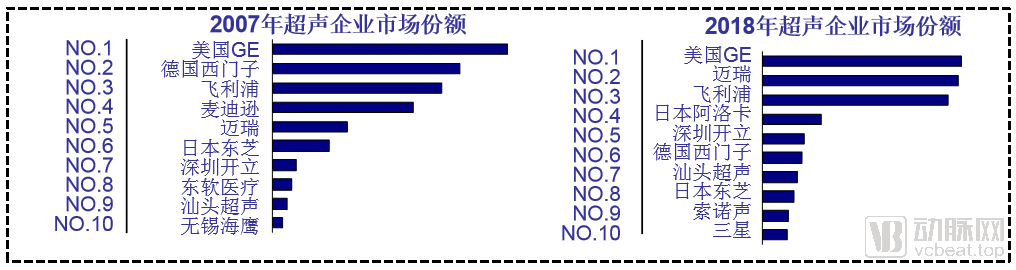 与心脏支架领域不同,超声领域市场份额逐渐向头部企业集中。2007年,国内超声市场份额主要被GE、西门子、飞利浦、麦迪逊等国外企业把持,迈瑞、开立医疗、东软医疗、汕头超声、无锡海鹰等国产企业发力抢夺市场。2018年,GE、迈瑞、飞利浦三家企业占据国内超声市场份额近60%,高于其他企业合计市场份额。