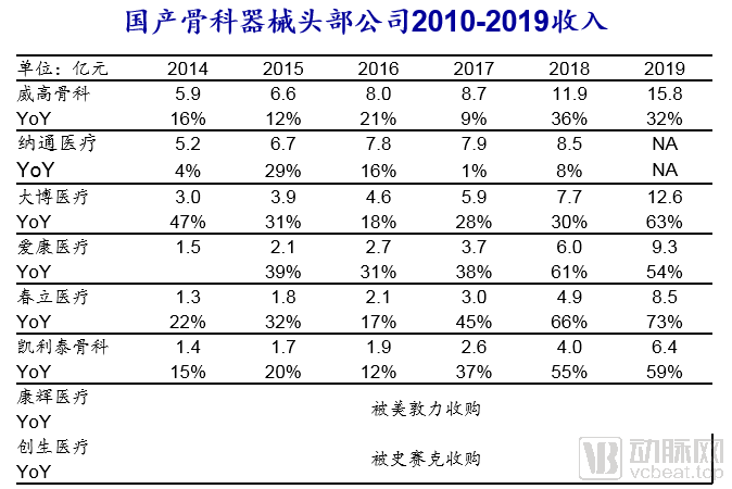 骨科领域,国内骨科器械头部企业稳步高速发展。威高骨科、纳通医疗、大博医疗、爱康医疗、春立医疗、凯利泰骨科等企业,在2010-2017年,每年的收入增长率大约保持在10%-30%,而2018年后,收入增长率约为50%-70%,说明相关企业发展迅速。